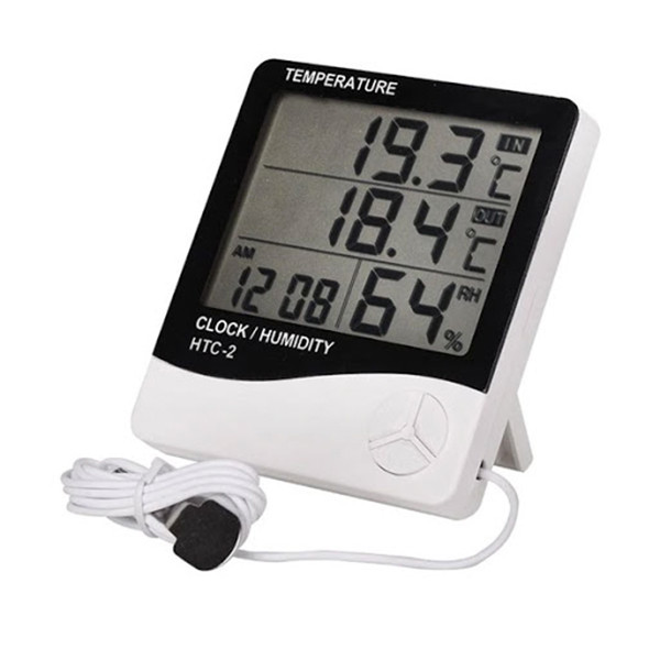 دماسنج رطوبت سنج HTC-2 برای اندازه گیری دما و رطوبت محیط بکار می رود. این دماسنج دیجیتالی محیطی بصورت رومیزی و یا دیواری قابل استفاده می باشد. این رطوبت سنج دیجیتال محیط دارای تاریخ و ساعت و حافظه ماکزیمم و مینیمم می باشد. دستگاه با یک باتری نیم قلمی چندین ماه تغذیه می شود.ویژگی های اصلی آن به شرح زیر است: